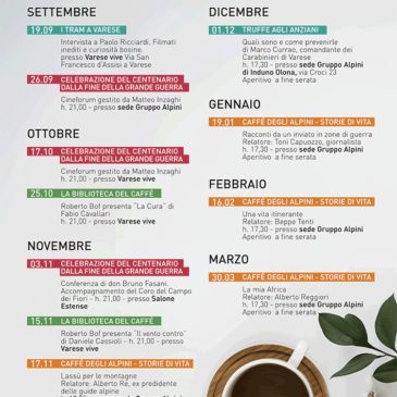 Eccoci giunti a questa nuova edizione di “Il caffè degli Alpini”, ampliata sia nei contenuti che nelle location. Si tratta come sempre di favorire momenti aggreganti, (comportamento insito innoi Alpini), tramite interviste, cineforum o tematiche cittadine. Vi aspettiamo come sempre … Continua